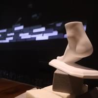 《物的語法》由石膏女足、沙發、木桌、稿紙與磚塊共同構成。這些物件被安置於同一空間之中,形成一種彼此對話的結構,探討當身體被物質化之後,存在如何仍然透過具象之物留下可被閱讀的語法。